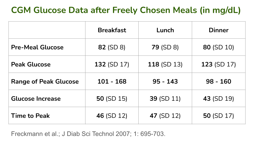 事实上,有一组研究人员对此进行了研究。Freckman及其同事研究了正常早餐、午餐和晚餐后的血糖反应。这些研究人员招募了 12 名女性和 12 名男性,都很年轻,体重和葡萄糖耐受性正常。研究人员在招募参与者之前进行了 OGTT,排除任何有糖尿病前期或糖尿病迹象的人。所以这 24 名年轻、苗条、健康的人可能是地球上葡萄糖耐受性较好的人群。他们应该能够提供一些见解,让我们了解正常人对全餐的血糖反应是什么样的。看看下面的表格。在每顿主餐之前,他们的血糖水平约为 80 – 82 mg/dL,平均增加量在 39 到 50 mg/dL 之间。有些人的血糖水平低于这个数字,但有些人的血糖水平高于这个数字。有些人的峰值血糖约为 160 mg/dL。也许他们的起始血糖不是 80 mg/dL,而是 95 mg/dL 左右(因为根据定义,他们的空腹血糖必须低于 100 mg/dL),但这仍然意味着他们的血糖增幅远远超过 60 mg/dL。