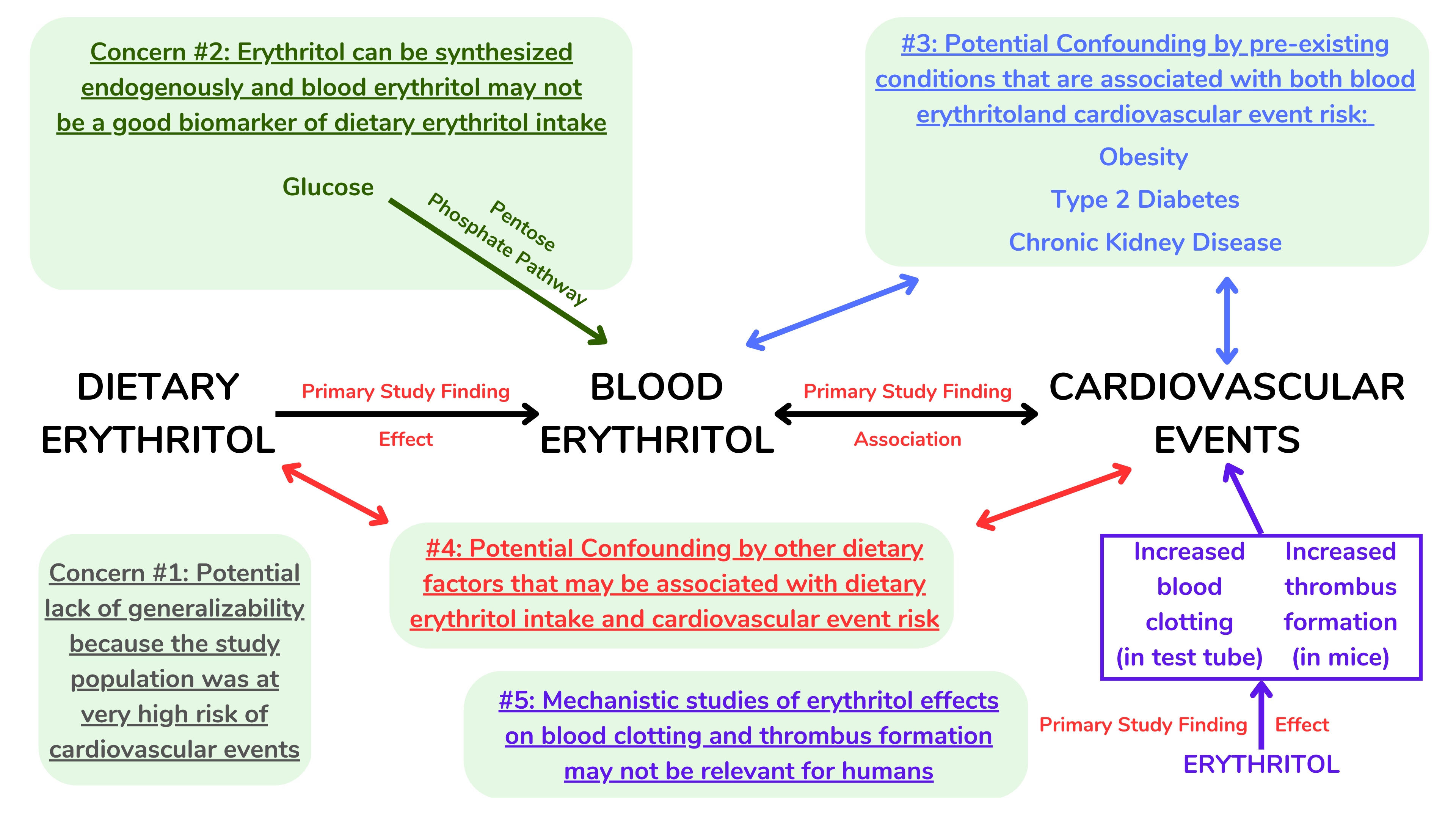 鉴于上述混杂甚至反向因果性的巨大潜力,这项研究的价值在很大程度上取决于作者表明赤藓糖醇会增加凝血和血栓形成的机制研究。鉴于这些研究是在试管中进行的,其中一项实验是在小鼠体内进行的,因此仍存在疑问,即这些数据是否适用于血液中赤藓糖醇水平升高的人类。