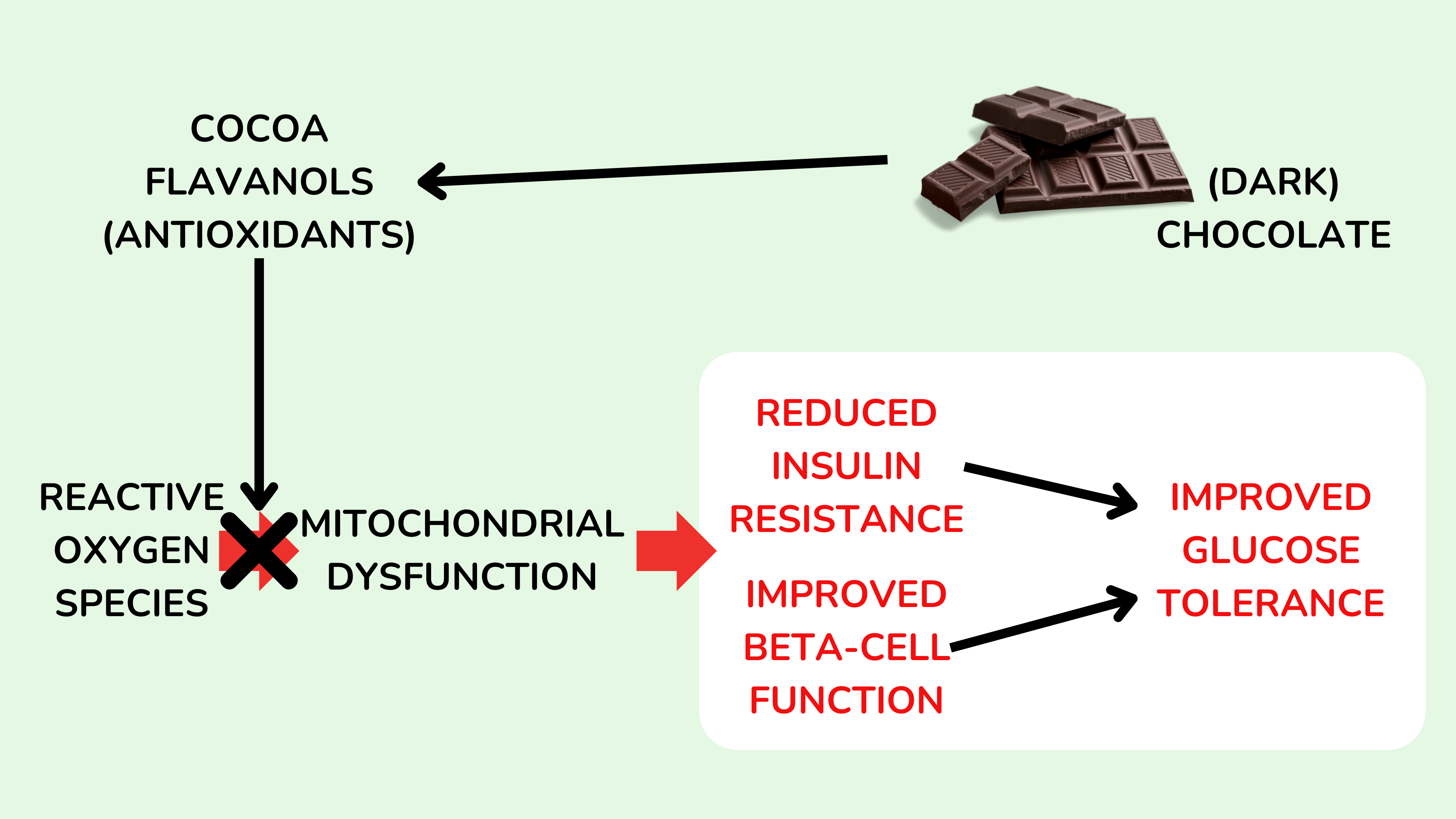 因此,虽然没有研究表明这是食用黑巧克力改善葡萄糖耐受性的确切机制,但这是一种潜在机制, 得到了多项间接证据的支持,包括: