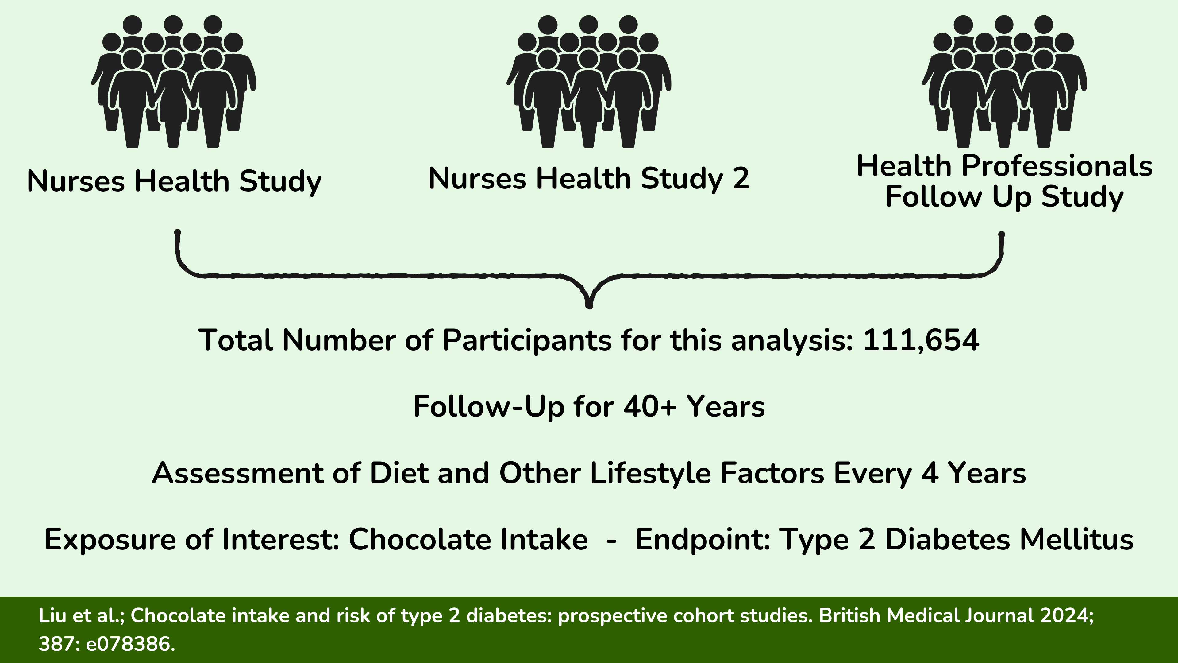 上个月初,一篇基于三个大型队列的新论文发表:护士健康研究、护士健康研究 2 和健康专业人员随访研究。总体而言,拥有来自这三个队列的 111,654 名参与者的数据。这些参与者在基线时均未患糖尿病,进行了 40 多年的观察。在此期间,每四年评估一次饮食摄入量和其他生活方式因素。该分析调查了巧克力消费是否与随访期间患 2 型糖尿病的风险有关。这是一项令人印象深刻的研究:规模非常大、随访时间非常长,反复评估饮食摄入量。
