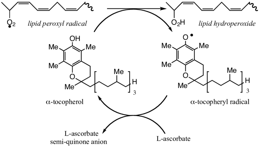 所以维生素E可以保护我们体内不同的脂肪成分免受脂质氧化的损害。我们这里有一张图来说明这一点。所以你体内有一个脂质氧化自由基。它与维生素E相互作用,形成脂质氢过氧化物,这基本上会抵消掉维生素E的这种作用。
