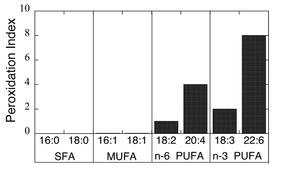 由于它们具有双键结构,因此很容易被过氧化。这里有一个表格,可以显示它们受损的可能性。我们发现饱和脂肪和单不饱和脂肪的受损可能性基本为零。它们受损的可能性非常非常低。但说到多不饱和脂肪,我们可以看到多达六种。