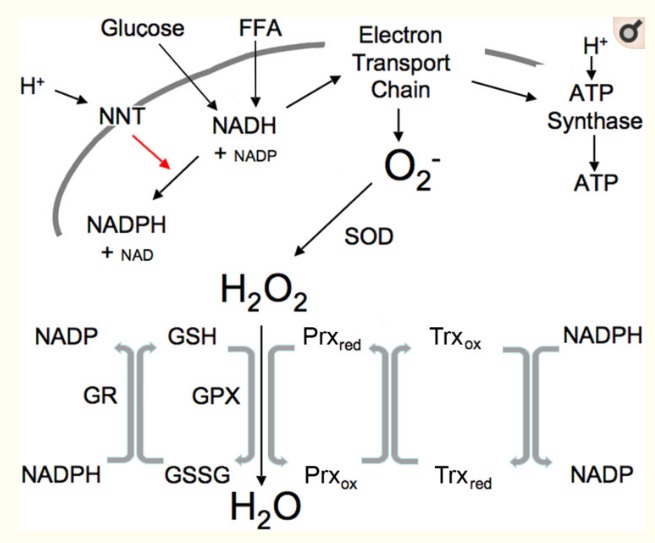 NAMPT 是 NAD 合成的限速步骤,NNT(位于线粒体膜中)将氢化物从 NADH 转移到 NADP + 与质子泵送穿过线粒体内膜。因此,葡萄糖和脂肪分解得越多(NADH 由 NAD 产生),电子传递链运行得越快,产生的 NADPH 就越多。