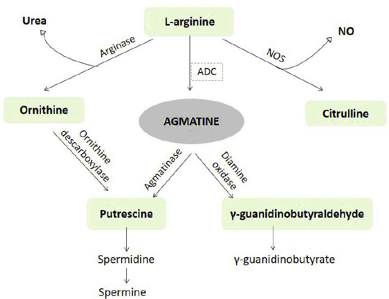 它由氨基酸精氨酸在精氨酸脱羧酶的作用下生成,可通过转化为腐胺进入多胺途径。
