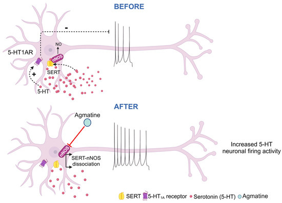 过量的一氧化氮会抑制背侧缝核 (DRN) 中正常的血清素能输出。